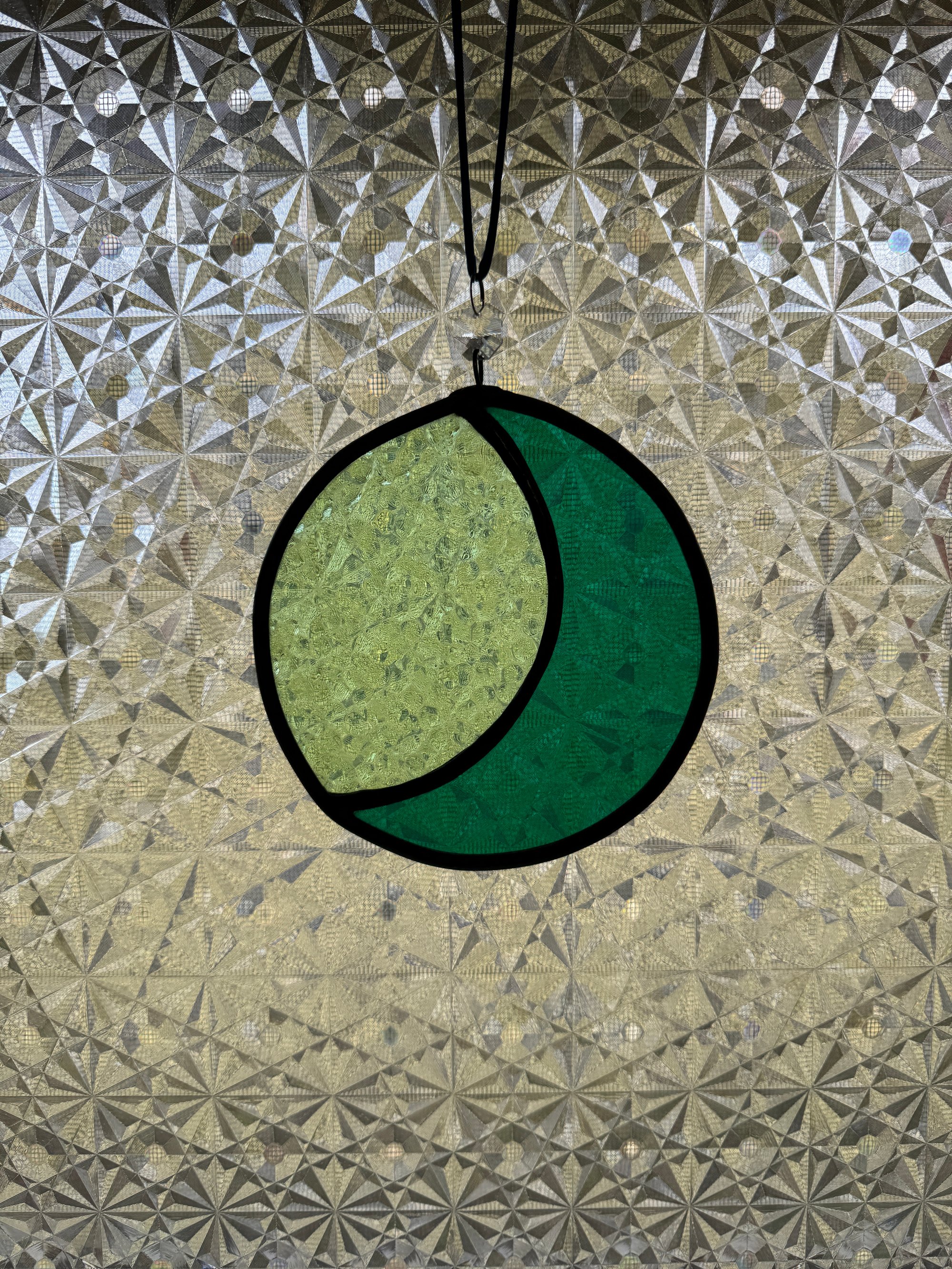 Handcrafted stained glass sun-catcher. Made with two shades of transparent green glass. Topped with prism bead to reflect light and hung from a satin cord.